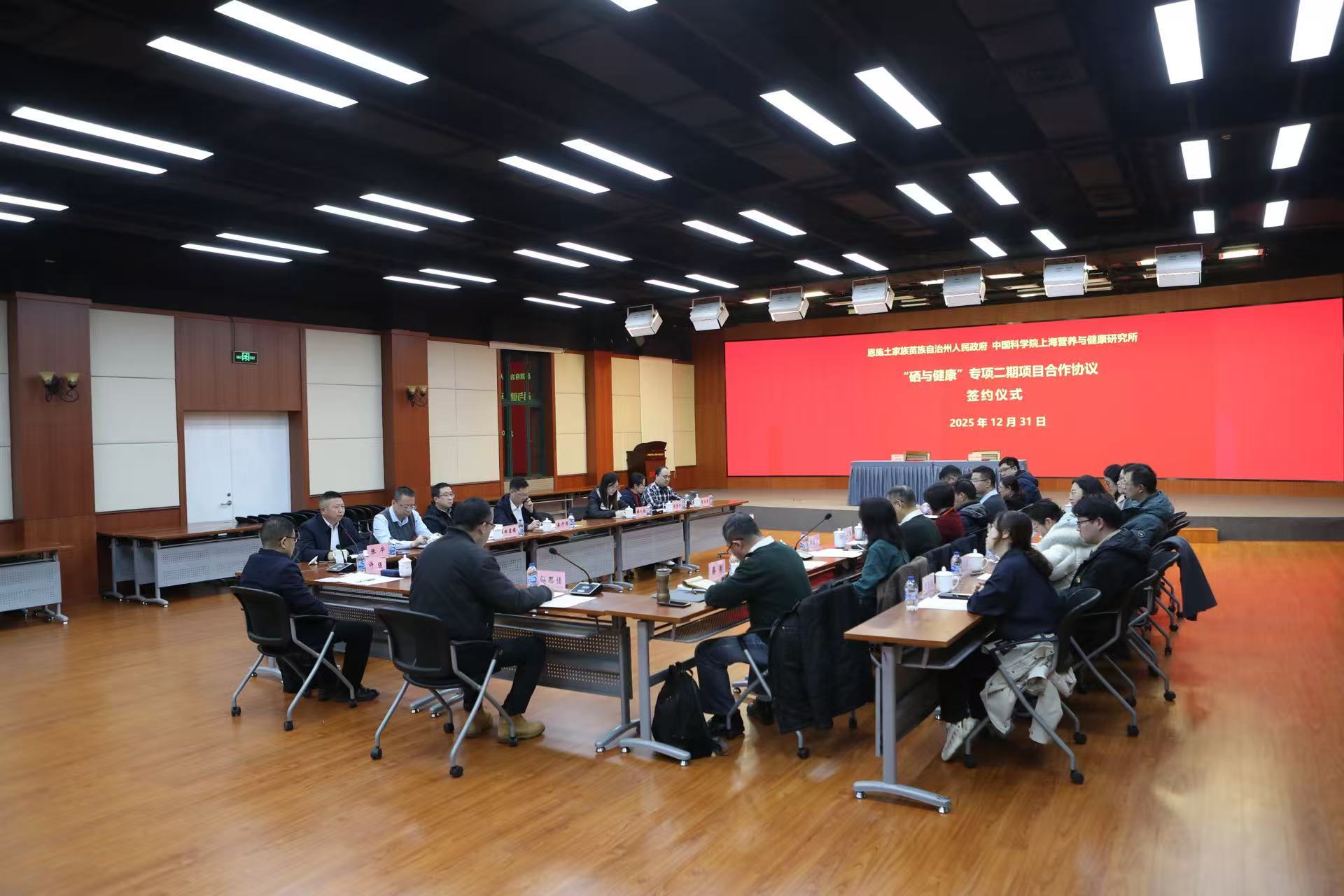 12月31日,恩施土家族苗族自治州人民政府与中国科学院上海营养与健康研究所签订“硒与健康”专项二期项目合作协议。恩施州人民政府副州长许强,营养与健康所所长汪思佳出席签约仪式,并共同签署合作协议。恩施州科学技术局局长张华,恩施州高新集团董事长胡铭,项目总顾问蔡澎研究员、项目负责人丁秋蓉研究员等项目组代表以及营养与健康所相关职能部门代表一同出席。会议由营养与健康所成果转化与合作处处长裴旸主持。